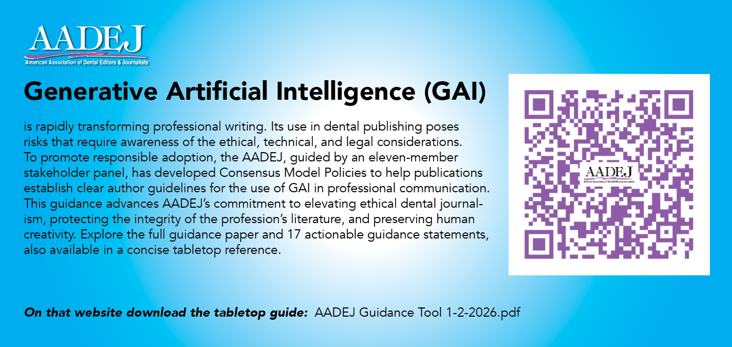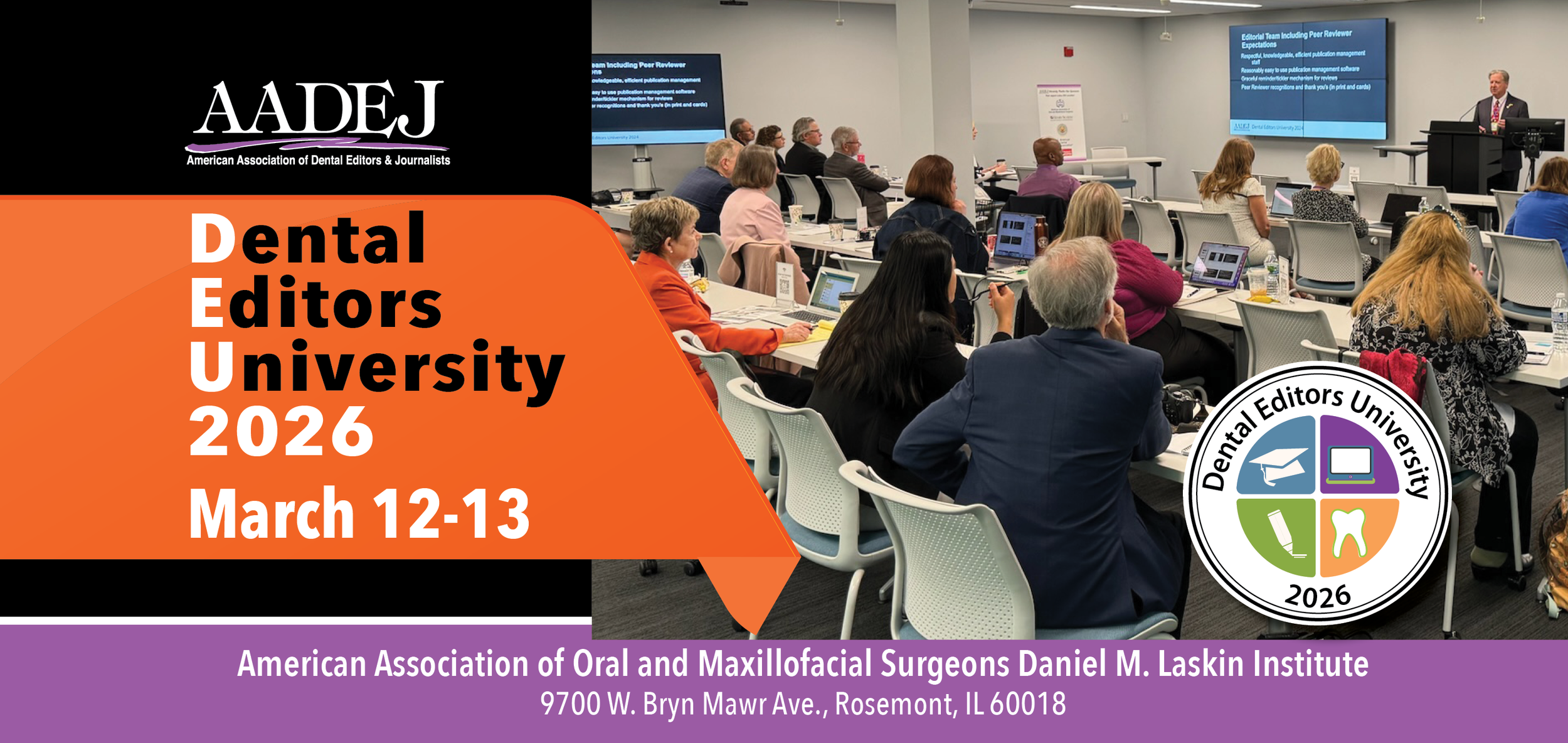 Editors and staff associated with the production of dental publications and others interested in dental journalism are eligible to join the AADEJ. Enjoy networking with other editors and staff in the dental world. Take advantage of the webinars, seminars, annual meeting, and dental editor universities to enhance your skills, your publication, and awareness of current trends, in print, digital, and social media. AADEJ also offers credits to earn a Certified Dental Editor accreditation.